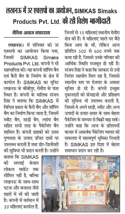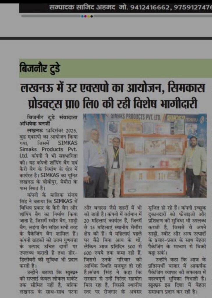 लखनऊ में आयोजित UR Expo 2025 में इस वर्ष कई प्रमुख कंपनियों ने हिस्सा लिया, जिनमें Simkas Products Pvt. Ltd. की उपस्थिति विशेष रूप से आकर्षक रही। कंपनी ने अपने उच्च गुणवत्ता वाले नॉन-वूवेन बैग और पैकेजिंग उत्पादों के माध्यम से दर्शकों का ध्यान खींचा और अपने अत्याधुनिक उत्पादन तकनीक का प्रभावशाली प्रदर्शन किया।